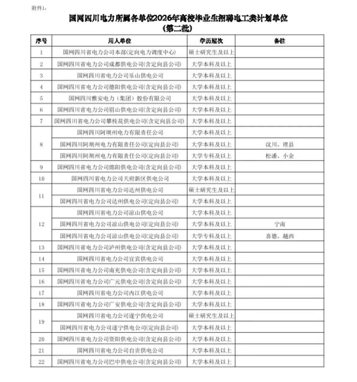 2.国网四川电力所属各单位一般要求大学本科及以上学历;艰苦偏远地区(甘孜、阿坝、凉山等)单位根据招聘计划和生源情况,可招聘电工类专科应届毕业生。四川各地市三新公司电工类专业要求大学专科及以上学历,非电类专业要求大学本科及以上学历。